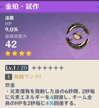 元素爆発を発動した場合の6秒間、2秒毎に元素エネルギーを(4/4.5/5/5.5/6)回復し、チーム全員のHPを2秒毎に(4/4.5/5/5.5/6)%回復する。