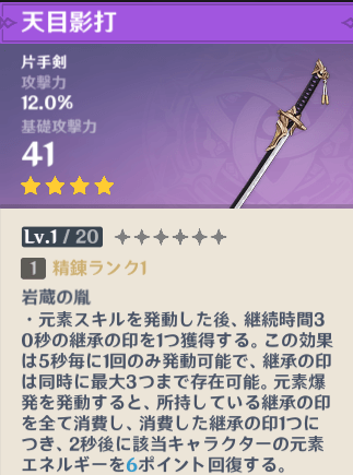 元素エネルギーを回復させる効果のある武器スキルを持つ武器です。