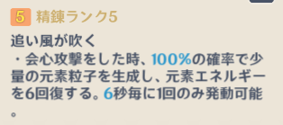 会心攻撃をした時、(60/70/80/90/100)%の確率で少量の元素粒子を生成し、元素エネルギーを6回復する。(12/10.5/9/7.5/6)秒毎に1回のみ発動可能。