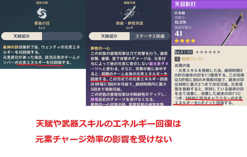 - 武器スキル/天賦によるエネルギー生成は元素チャージ効率の影響を受けない