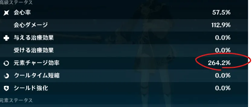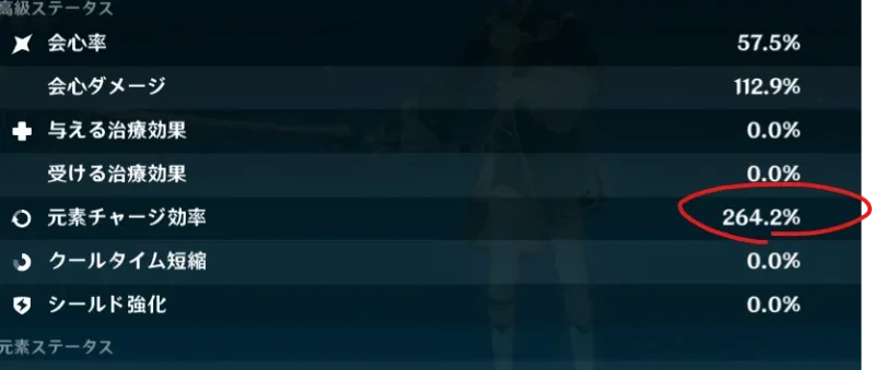 元素粒子を受け取った際のエネルギー回復量を高めるステータスです。聖遺物や武器といった装備で増加する他、キャラクターのレベル上昇時に上昇するキャラクターもいます。(★4キャラは28%、★5キャラは32%)