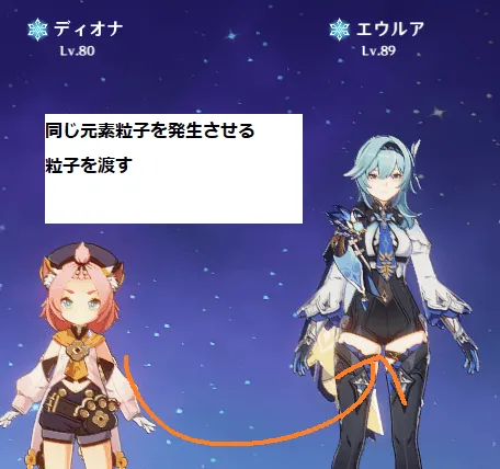 また、粒子の属性と一致するキャラクターはより多くの元素エネルギーを回復します。これは控えも同様です。(なので、エウルアのお供に祭礼ディオナを入れたりするわけですね)