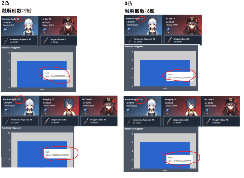 gcsimにより「綾華爆発>胡桃8N2CJ+爆発」を試算した場合、元素反応の発生回数は6回から9回に上昇することが確認できました。