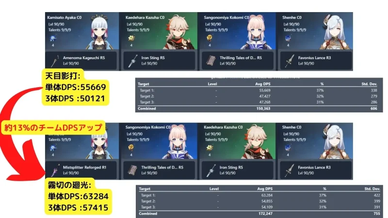 天目影打(精錬5)から霧切の廻光(精錬1)に持ち替えた場合、約13%のチームDPS向上になる計算でした。