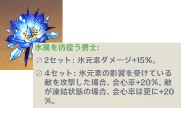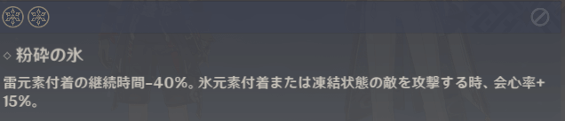 神里綾華の通常攻撃または重撃が敵に氷元素ダメージを与えた時、50%の確率で神里流・氷華(スキル)のクールタイム-0.3秒。