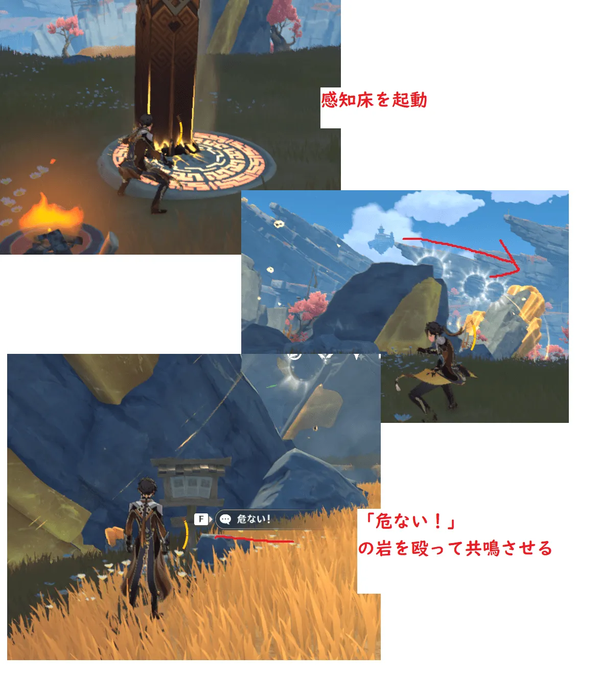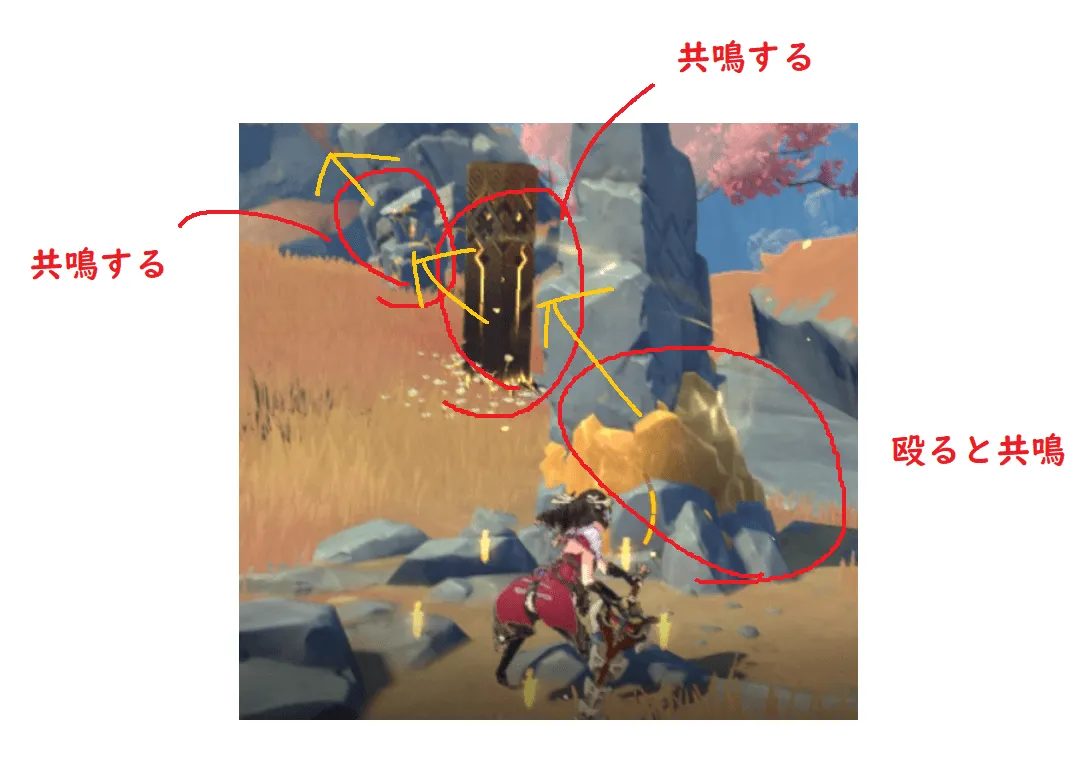 こちらは付近に「不思議な岩柱」がありませんが、付近にある大きな岩が共鳴できるので、画像のように解きます。