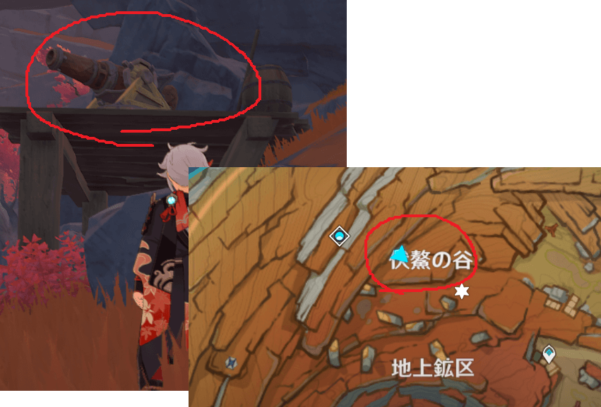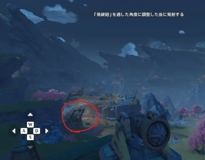 層岩巨淵に一箇所しか無いはずですが、この大砲は画像の赤丸、謎の機械に向けて撃つと、足元の岩を破壊できます。