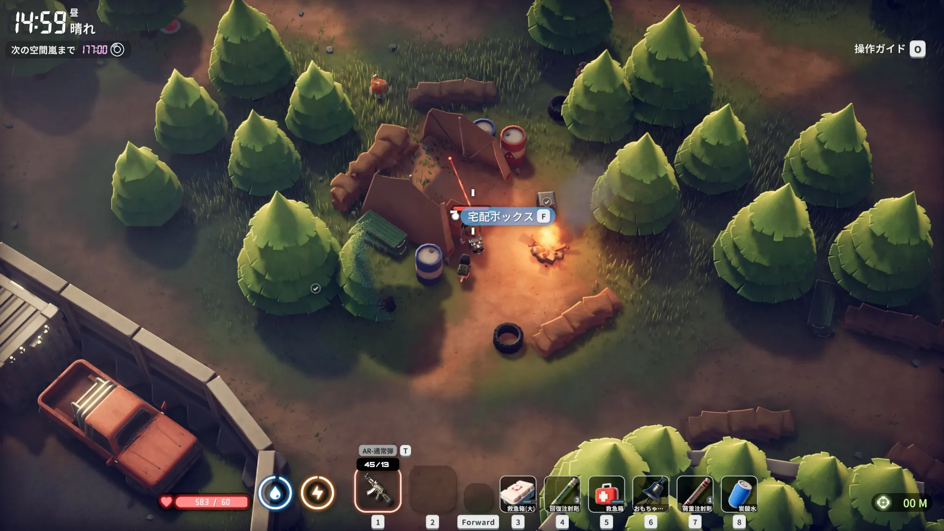 エリアゼロ「森の小道」キャンプから荷物を回収後、マップ移動して農場町を目指しましょう。