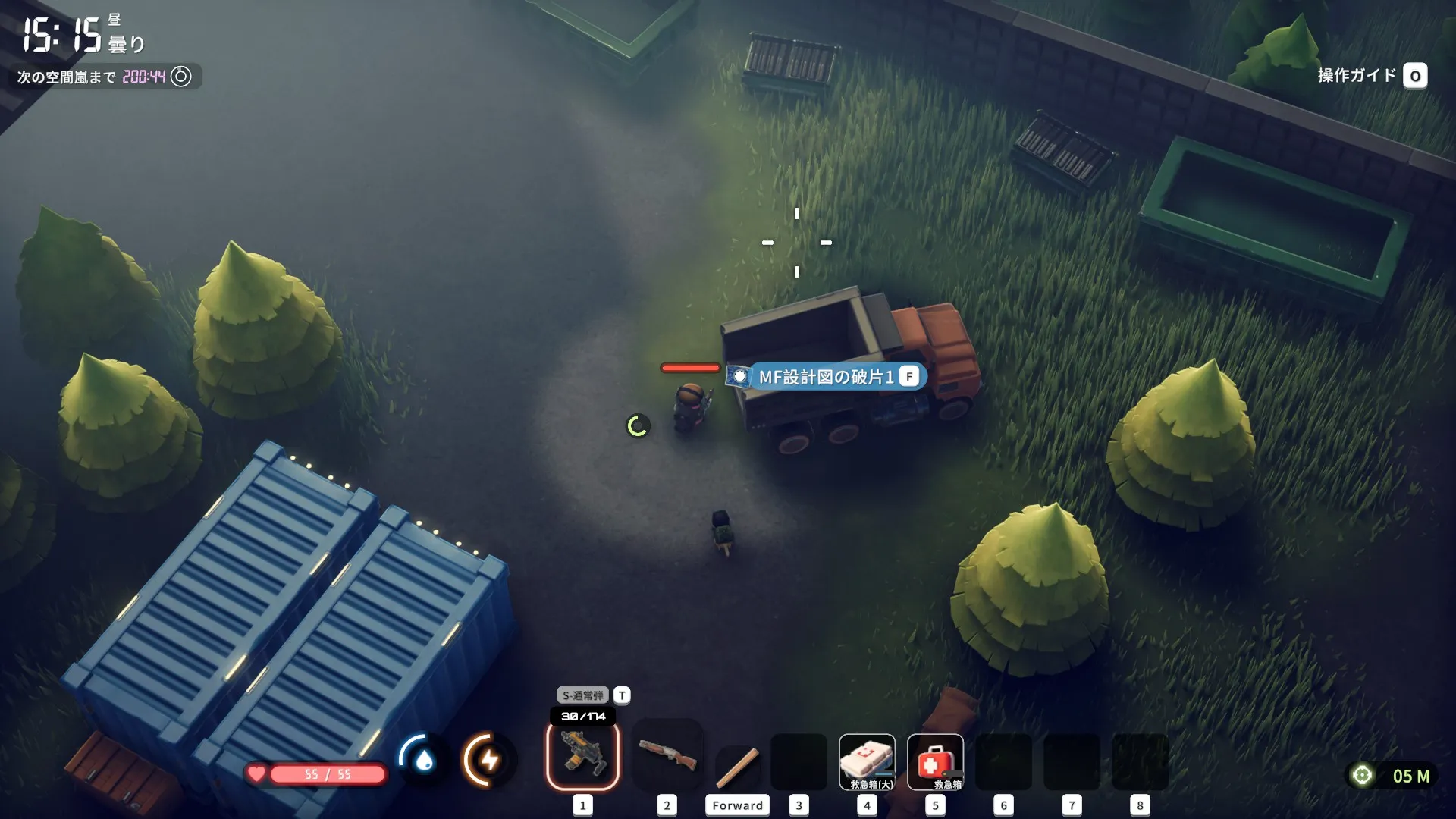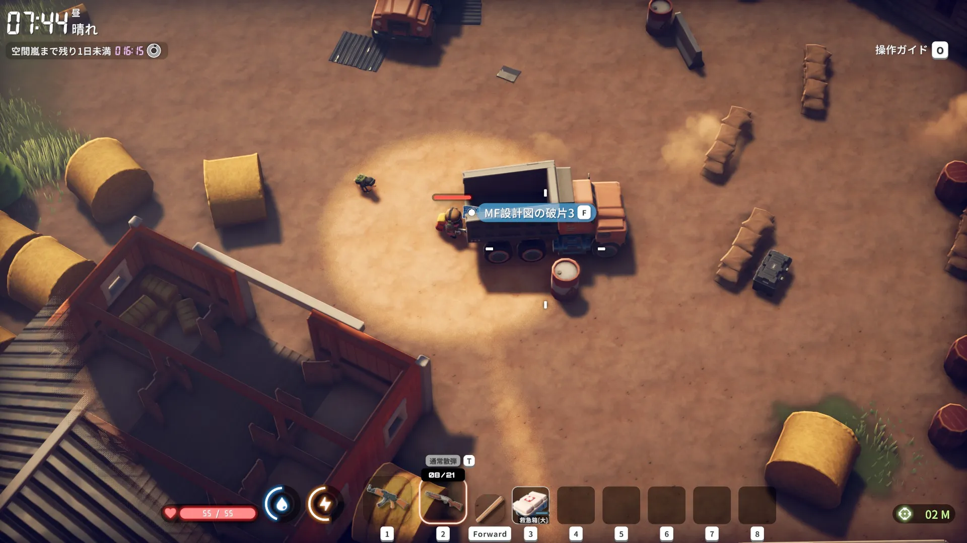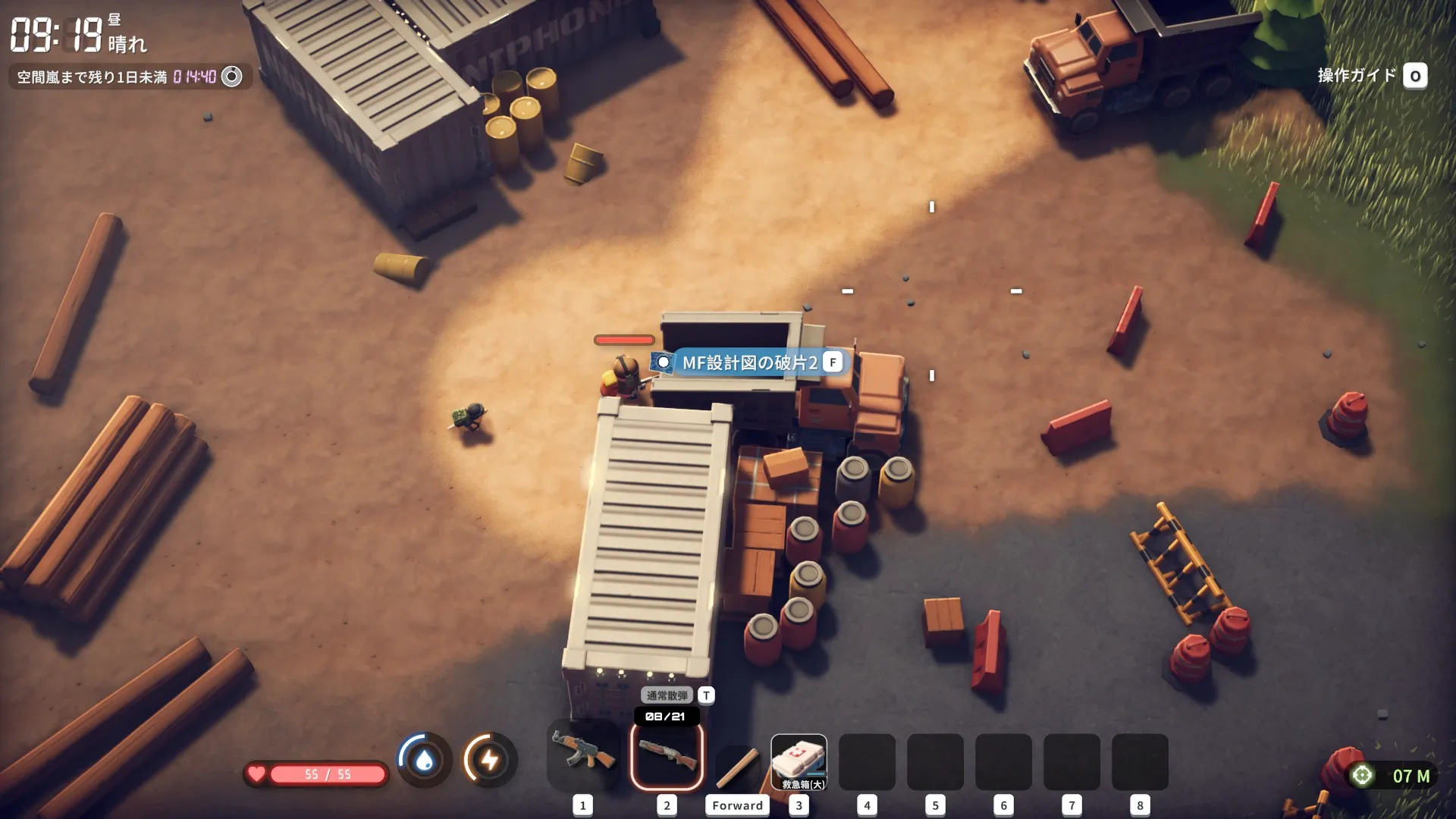 倉庫エリアの「西工場区画」「製材所」「農家」にあるダンプカーの荷台に「MF設計図の破片」があります。