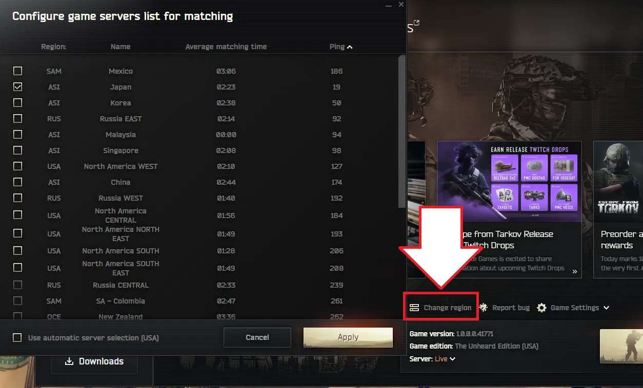 タルコフのゲームクライアントからゲームプレイする地域・リージョンを変更できます。