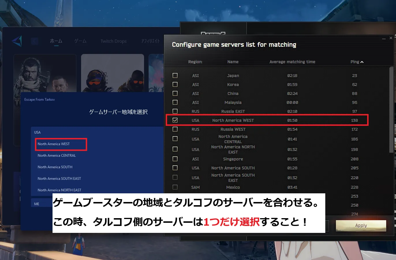 • GearUPとタルコフのサーバーを合わせる