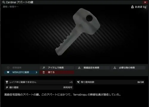EscapeFromTarkov(エスケープフロムタルコフ)、カギ「TerraGroupの社宅の鍵」の場所に関する情報を掲載しています。