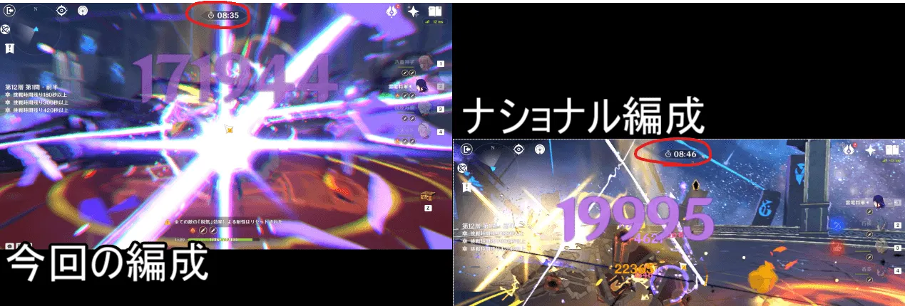 八重入り雷電編成(左)、ナショナル編成(右)の討伐時タイム