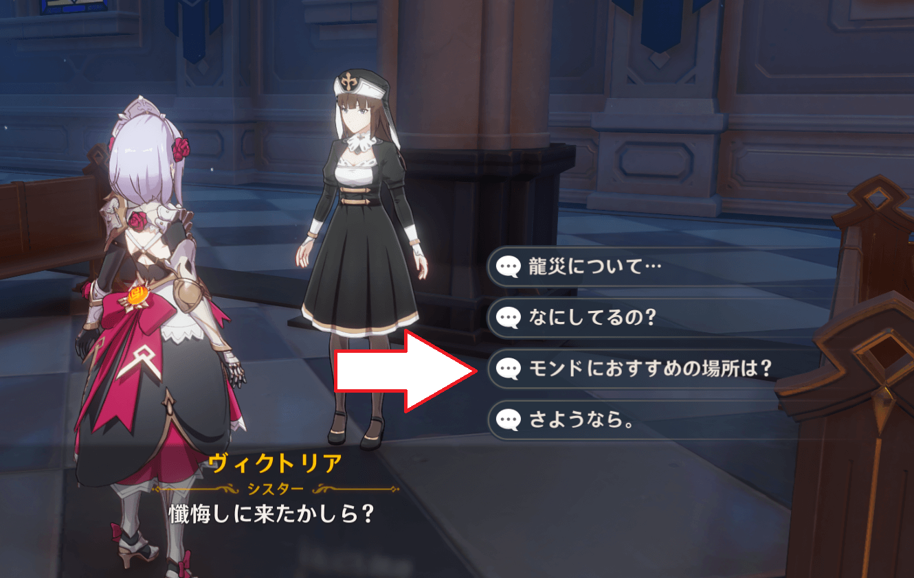 話しかけると選択肢が出てくるので、「モンドにおすすめの場所は?」の選択肢を選びます。