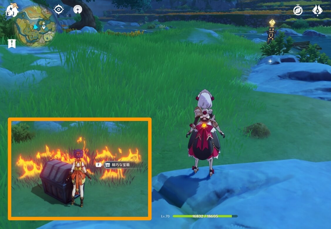 これら全ての落ち葉だまりを、炎元素・風元素で処理すると宝箱が出てきます。