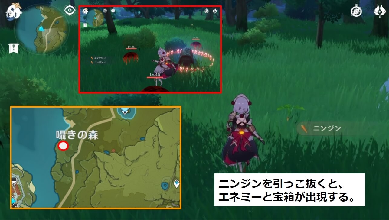 ニンジンやミントなどの採取アイテムを引っこ抜くと、「トリックフラワー」などのエネミーや宝箱が出てくることもあります。