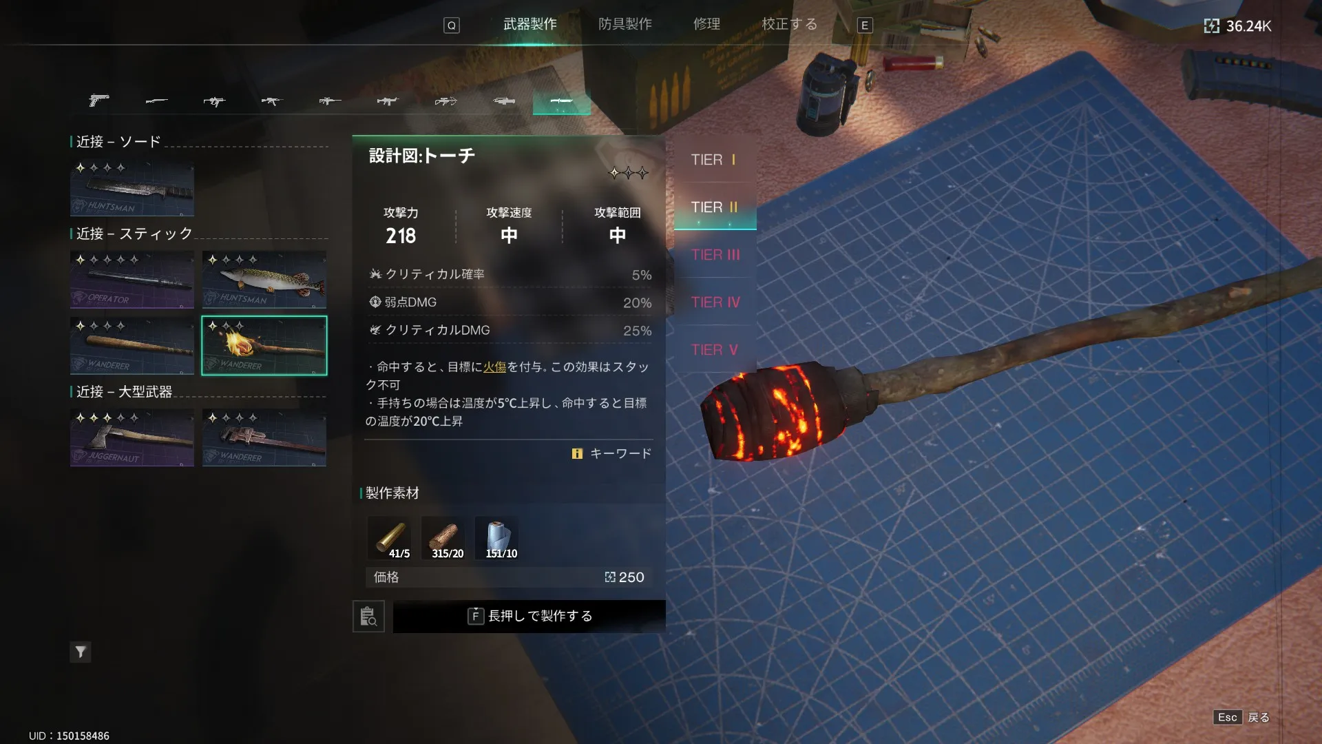 近接武器の「トーチ」には持っている場合に、温度が5度上がる効果があります。
