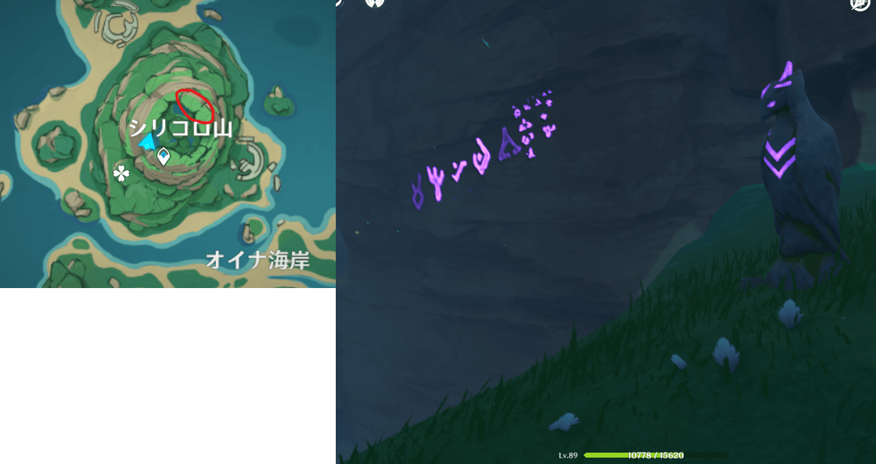 起動するとヒントが浮かび上がり、画像のように山の肌に浮き出た文字に「触れる」ことで点灯、浮き出た模様に対応する模様全て点灯すると、宝箱が出現します。