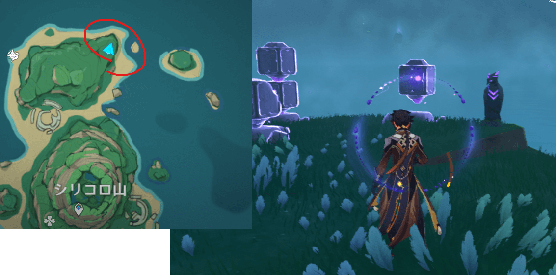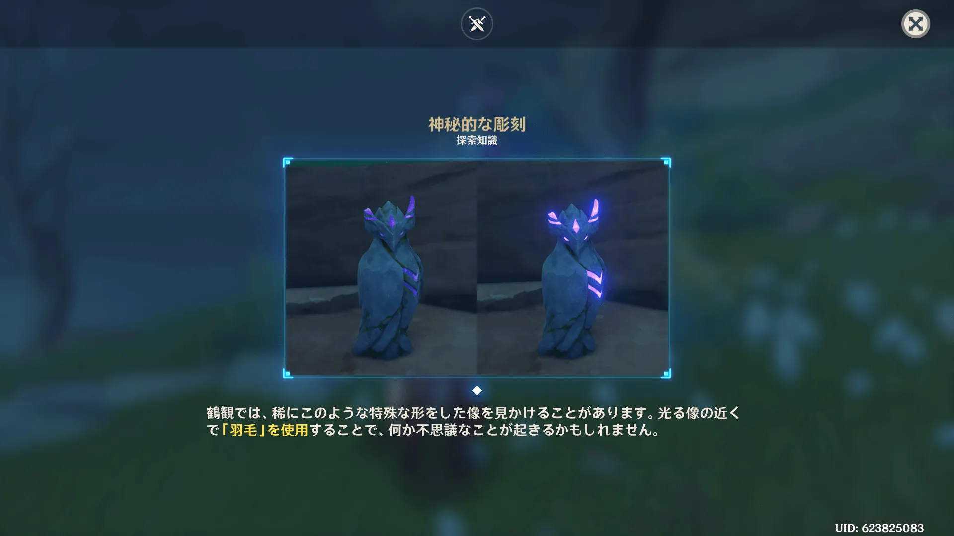 この像は、鶴観島関連の世界任務の二日目報酬で入手できる便利アイテム「変わった羽毛」で起動できるようになります。