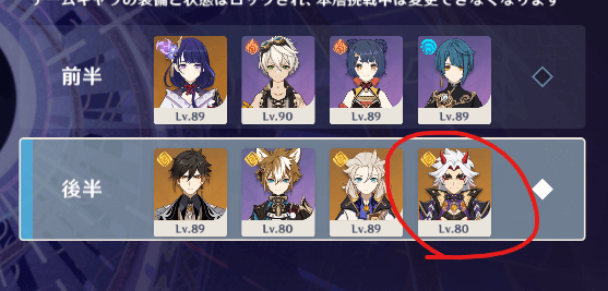 - 前半 … 雷電(0凸) – ベネット(5凸) – シャンリン(6凸) – 行秋(6凸)
