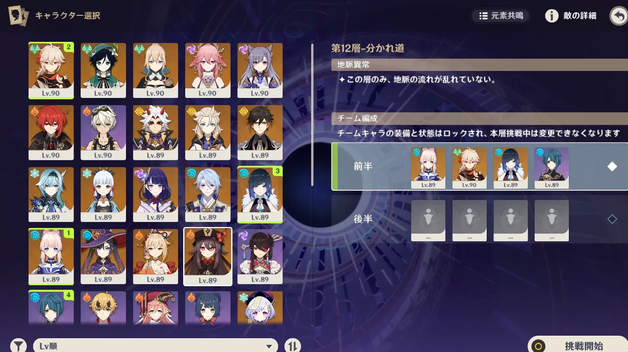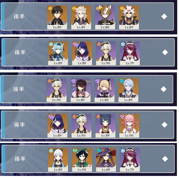 自分のキャラプールからだとこんな感じの編成が後半PTになりますが、やや使いづらい編成が多いかなーと感じます。