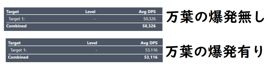 試算では、万葉の爆発有無で3000DPS程度変動する計算になりました。