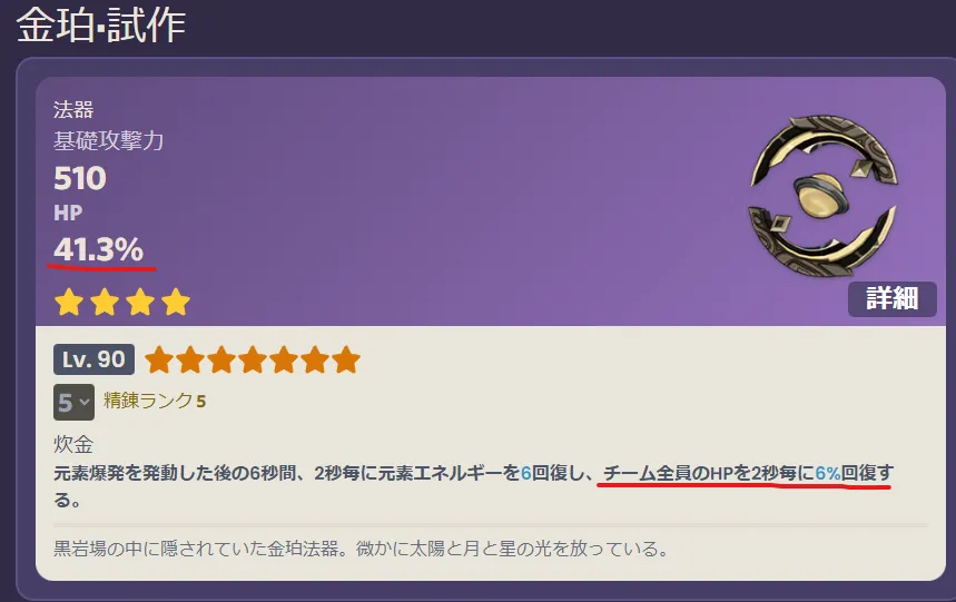 金珀・試作は心海に持たせるとやや過剰ヒール気味な武器スキルですが、これもダメージに変換できます。