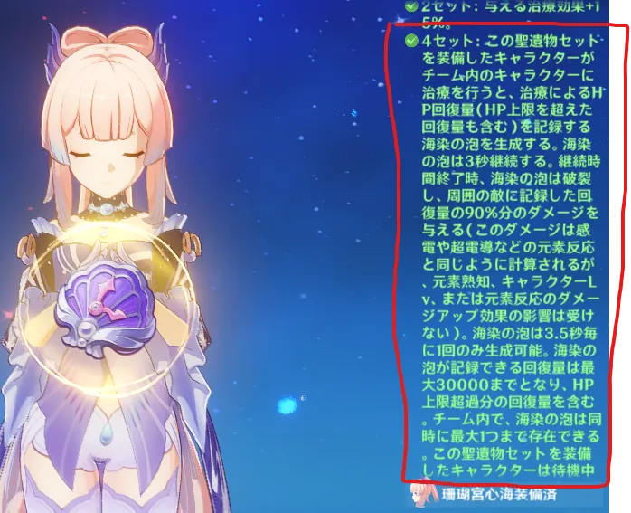 - 海染め4セットと爆発中の心海のヒール性能(通常攻撃で回復)