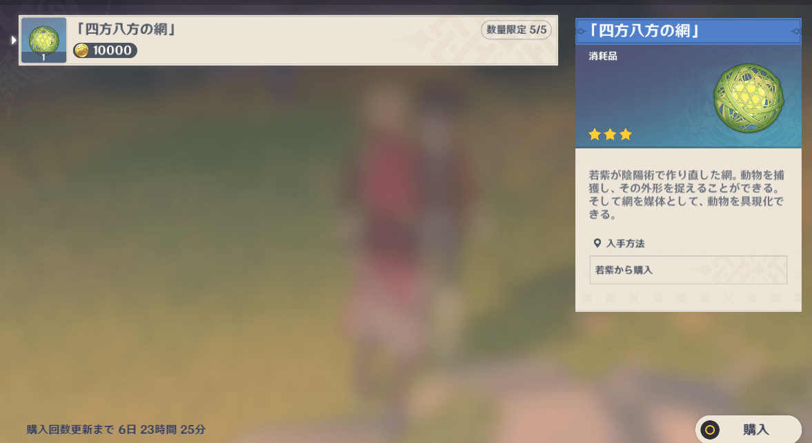 また、稲妻のNPC「若紫」は「四方八方の網」を1つ10000モラで販売しています。これは週に5つ購入可能で、週が変わると購入制限がリセットされます。