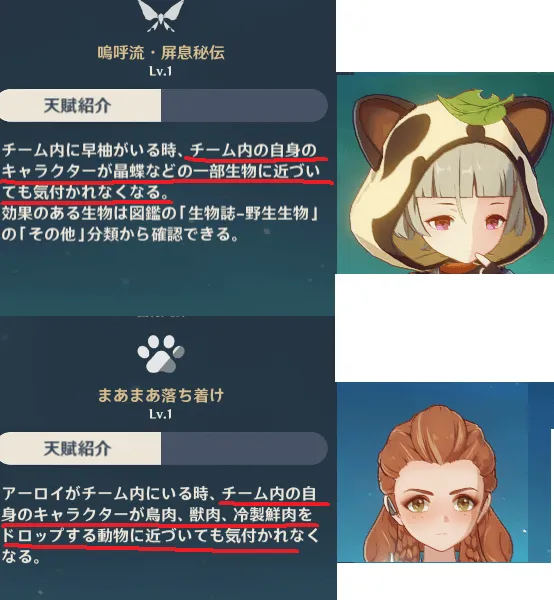 ★4キャラ「早柚」★5配布キャラ「アーロイ」は常在天賦に野生生物が逃げなくなる天賦を持っているので、腰を据えて捕獲作業にかかる際にどうぞ。