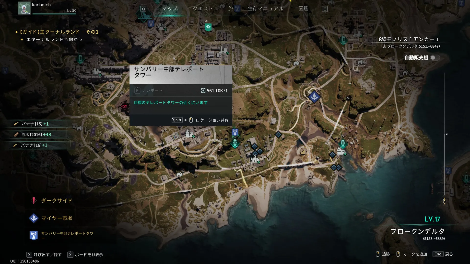 「ヤシの実」と「バナナ」の入手場所は、「サンバリー中部テレポートタワー」付近がおすすめです。
