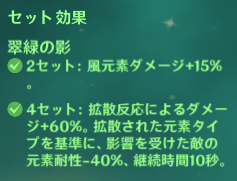 さらに、風元素キャラは「翠緑の影」セット効果によってメインアタッカーのための耐性ダウンを行うことが出来ます。