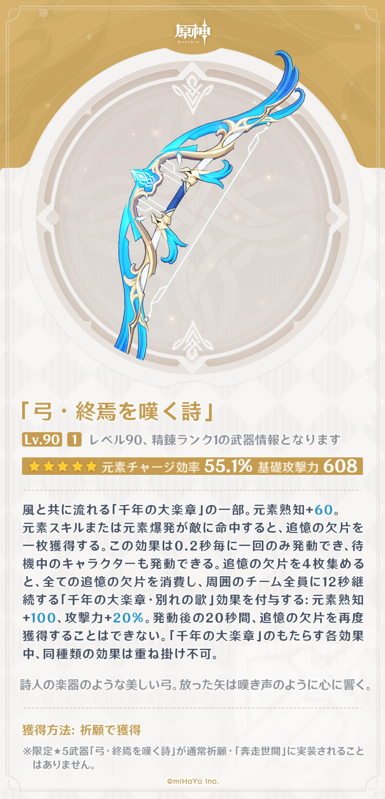 武器は★4であれば絶弦や祭礼シリーズ、★5であれば天空の翼のようなスキルや元素爆発が強くなる武器が良いでしょう。