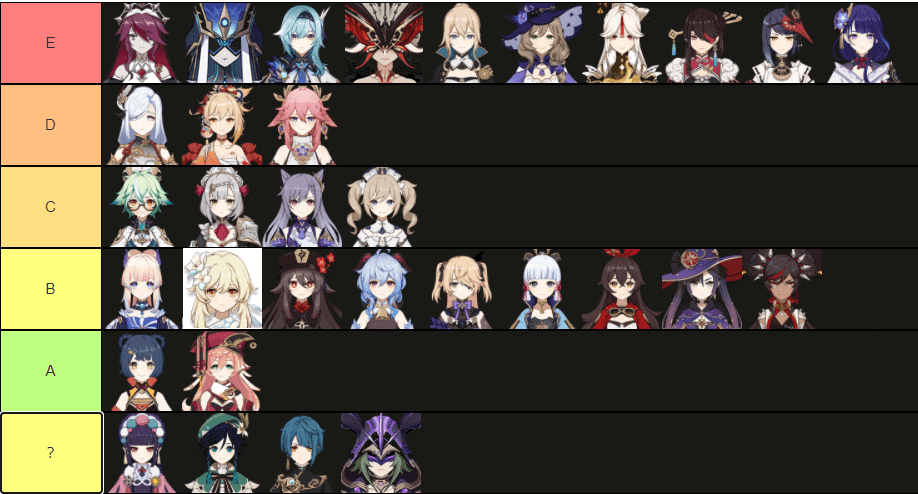 このシート内の数値と記述を正直に受け取ると、以下のようなティアリストを作成できます。