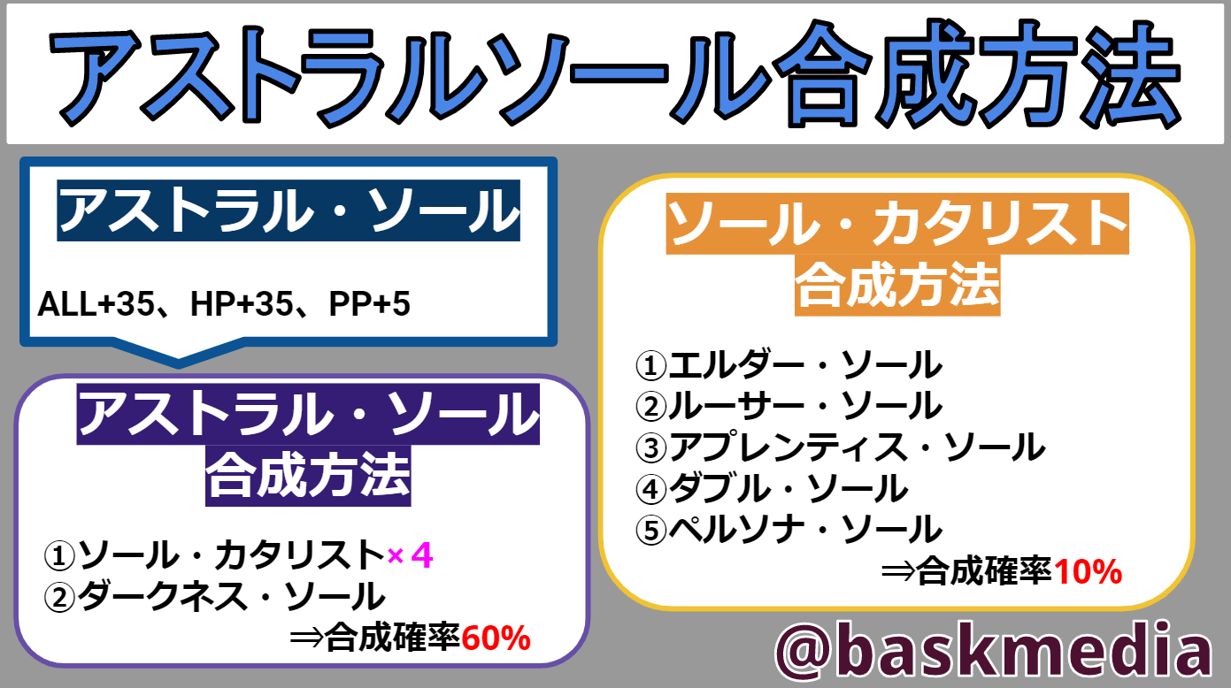 アストラルソールのステータス(性能)や、合成確率と継承確率なども紹介しています。