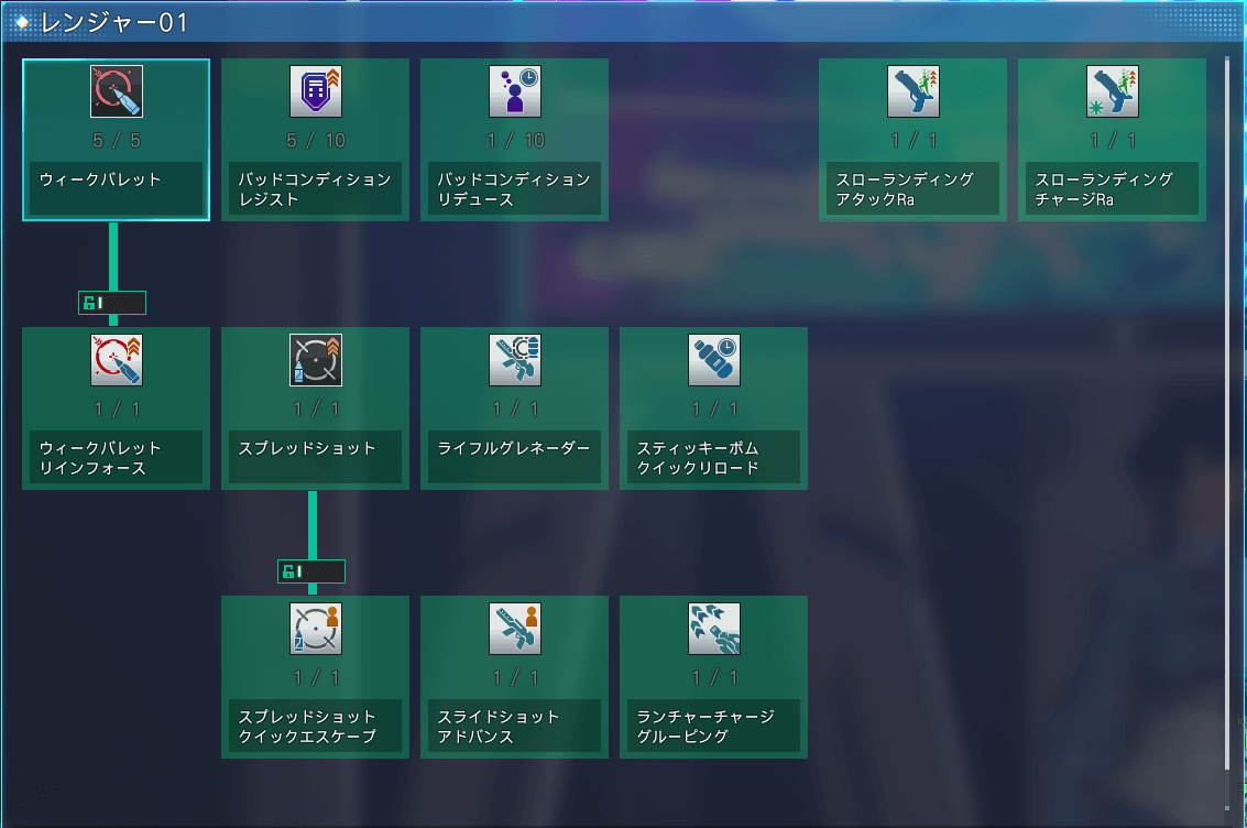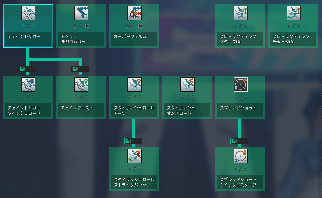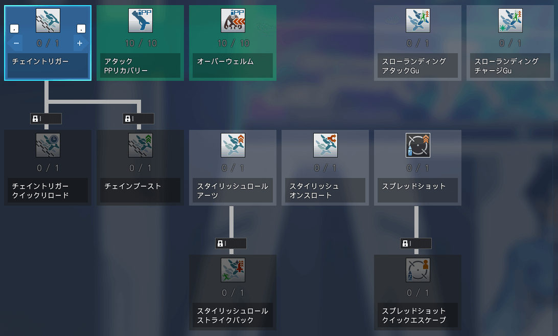 Gu(ガンナー)のスキルツリーは主要なスキルをすべて取得できるようになっているため、「アタックPPリカバリー」「オーバーウェルム」この2つのスキルポイント配分しか違いの出ないツリーになっています。