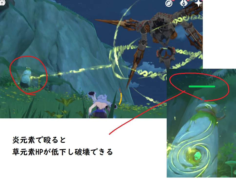 草っぽい光が出ている岩は、草の種状態で重撃/狙い撃ちすると破壊することが出来ます。