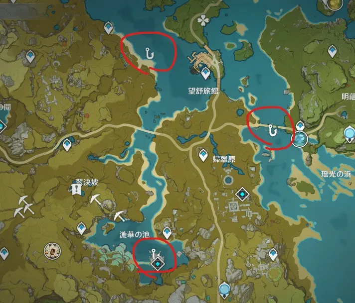 公式マップアプリであるテイワットマップによると、以下の釣りスポットにこれら3種類の魚が出現する可能性があるようです。
