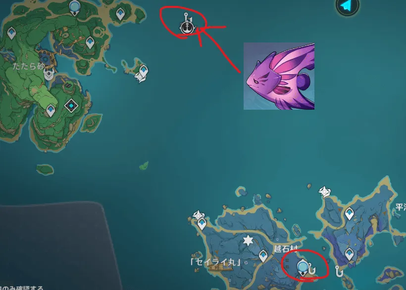 • 「漁獲」凸用の魚は別の魚なので、別途テイワットマップで探すこと