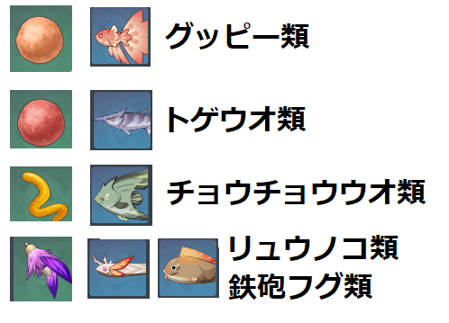 以下の類の魚に対して、以下の餌が対応しています。