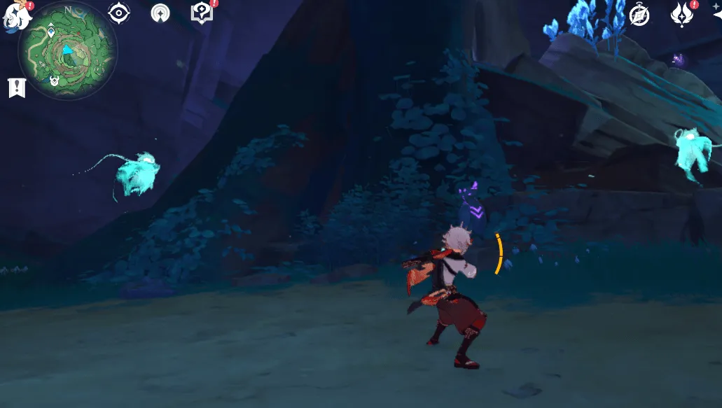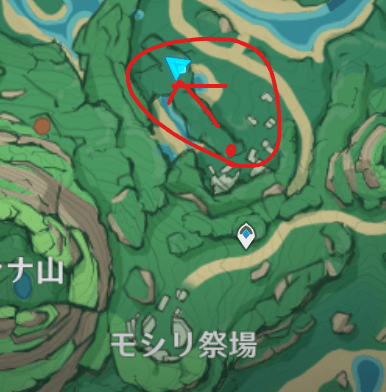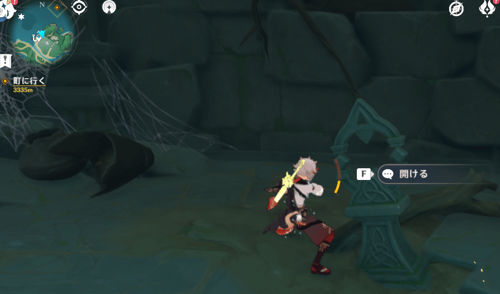 画像の位置にある雷鳥像(数カ所像があり、迷子になりやすいので注意)を起動すると仙霊が登場するので、仙霊を追ってイシネ文字の石を回収。