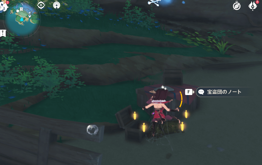 この宝箱を入手後、最初の「宝盗団のノート」のあった洞窟へ再度訪問し、再度、「宝盗団のノート」を調べることで豪華な宝箱と隠し実績「遠海牧人の宝物」を入手することができます。