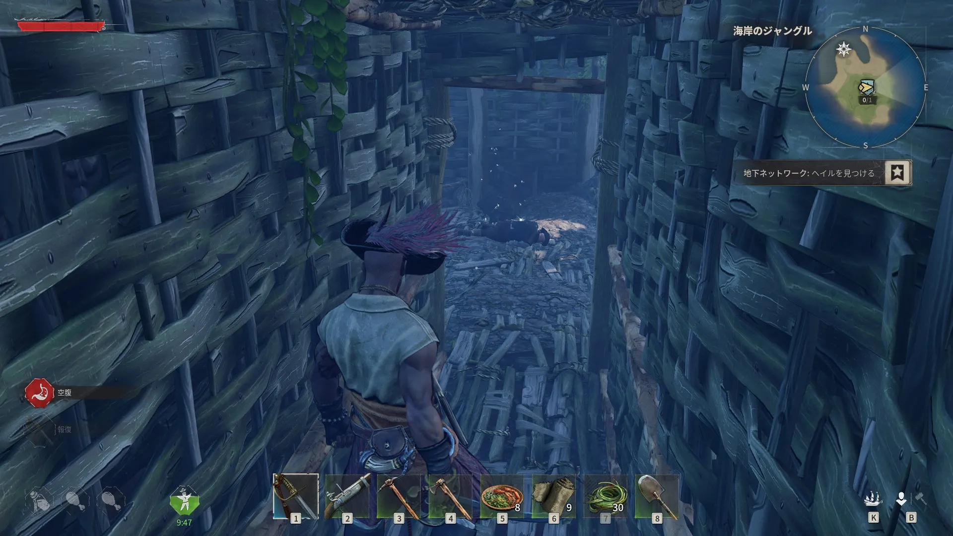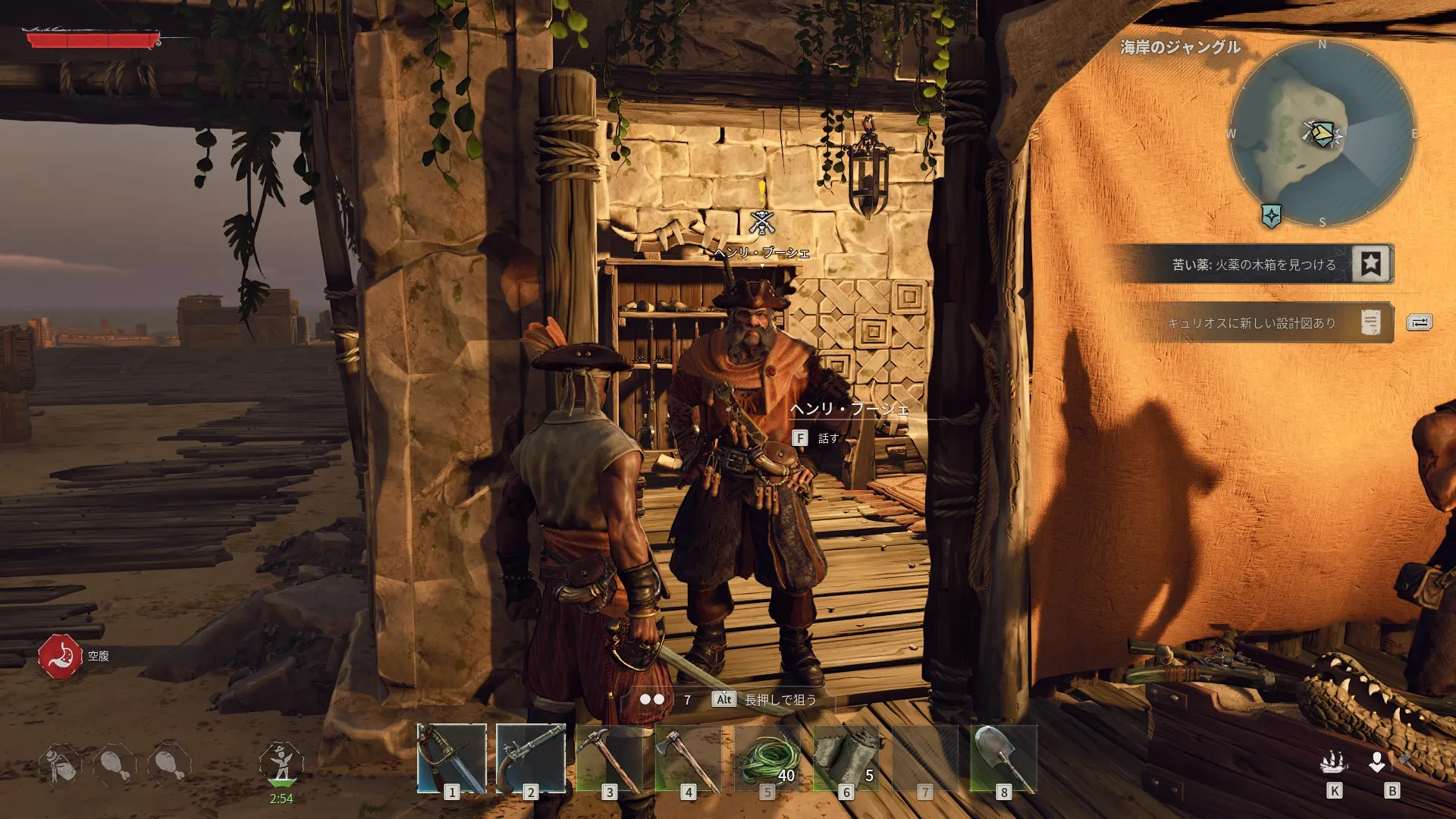 - 海のせいで服はボロボロだ。イノシシの皮を手に入れて、何か縫い合わせる必要がある。