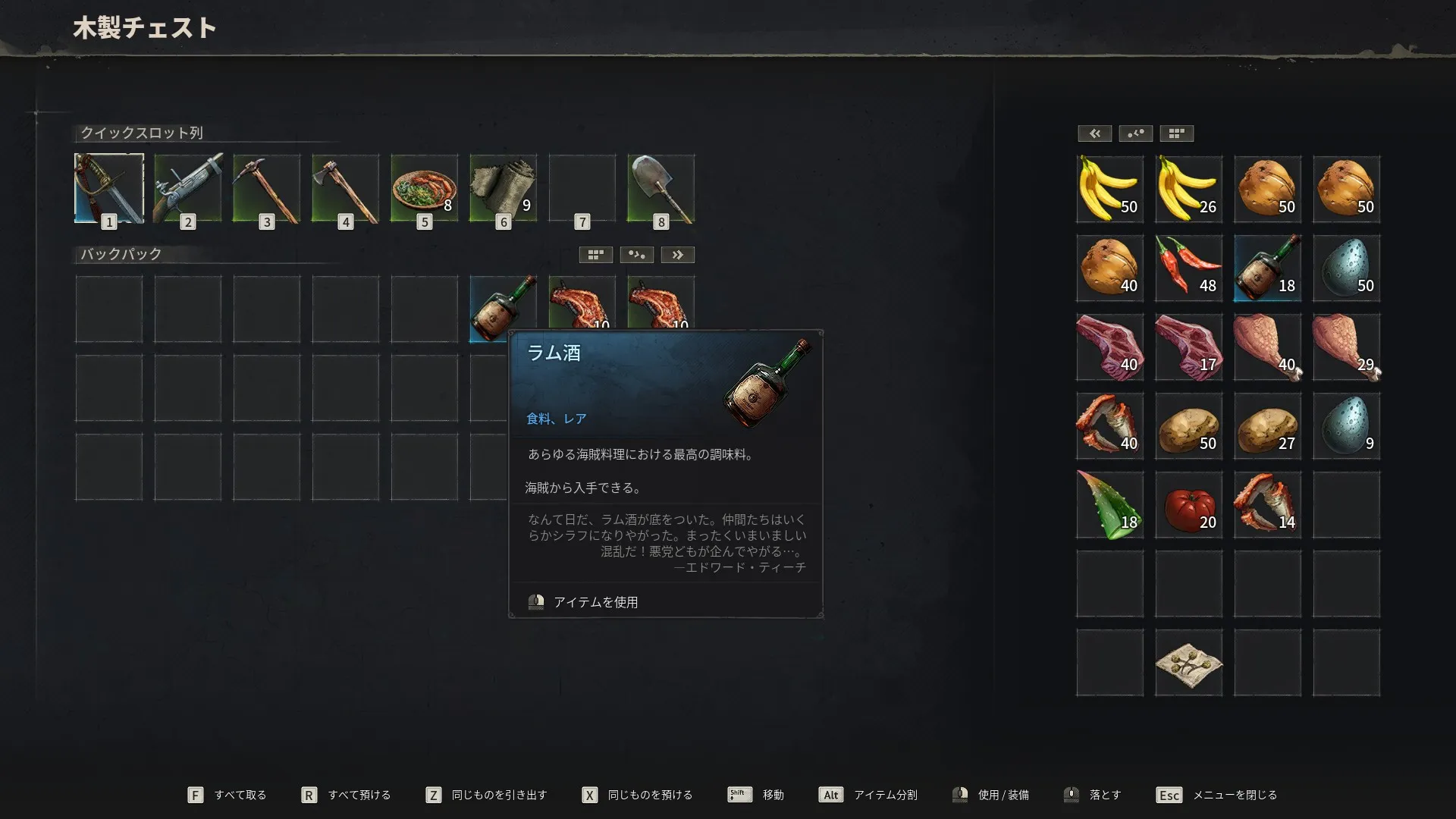 - なめし革をチャーリー・シャープに届けた。次は肉の串焼きを20個作り、ラム酒の樽と一緒にバッカニアたちに渡してほしいと彼は言っている。