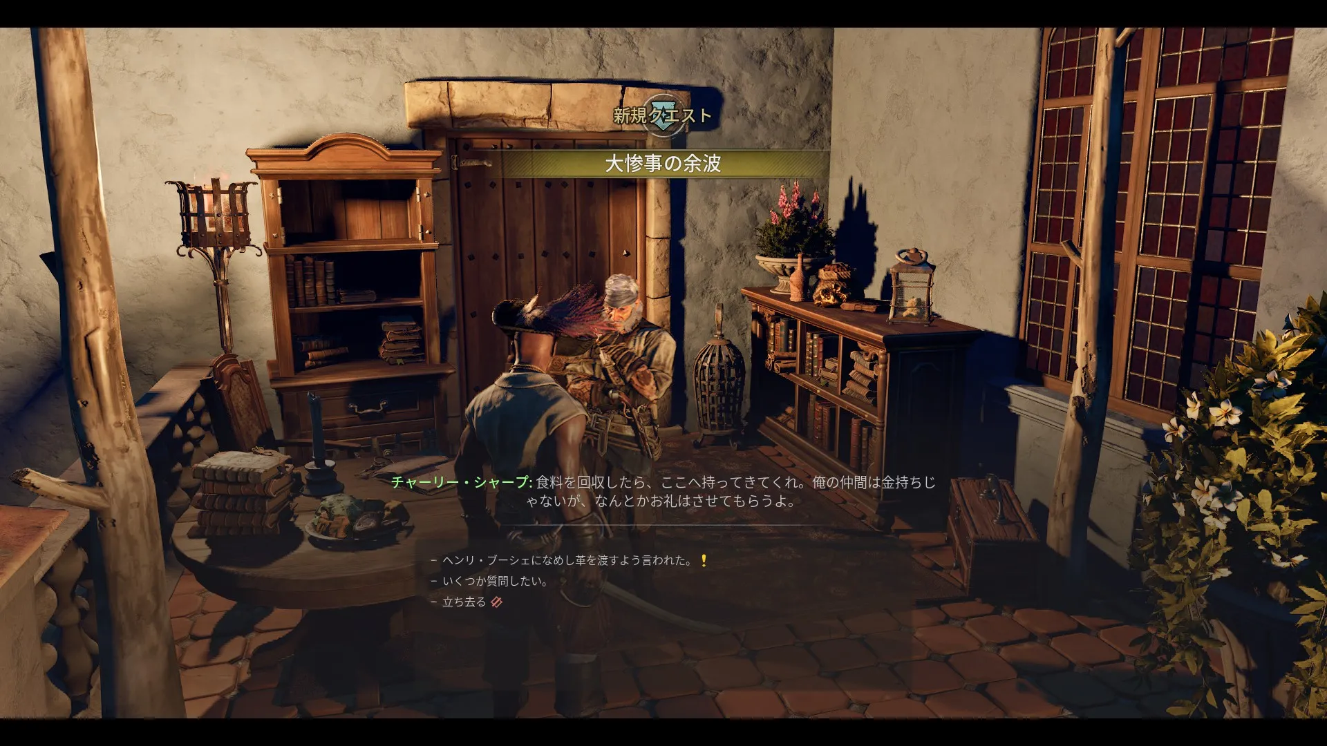 - ヘンリは火薬の礼を言い、トルトゥーガの民のキャンプにいるチャーリー・シャープになめした革を届けてほしいと頼んできた。
