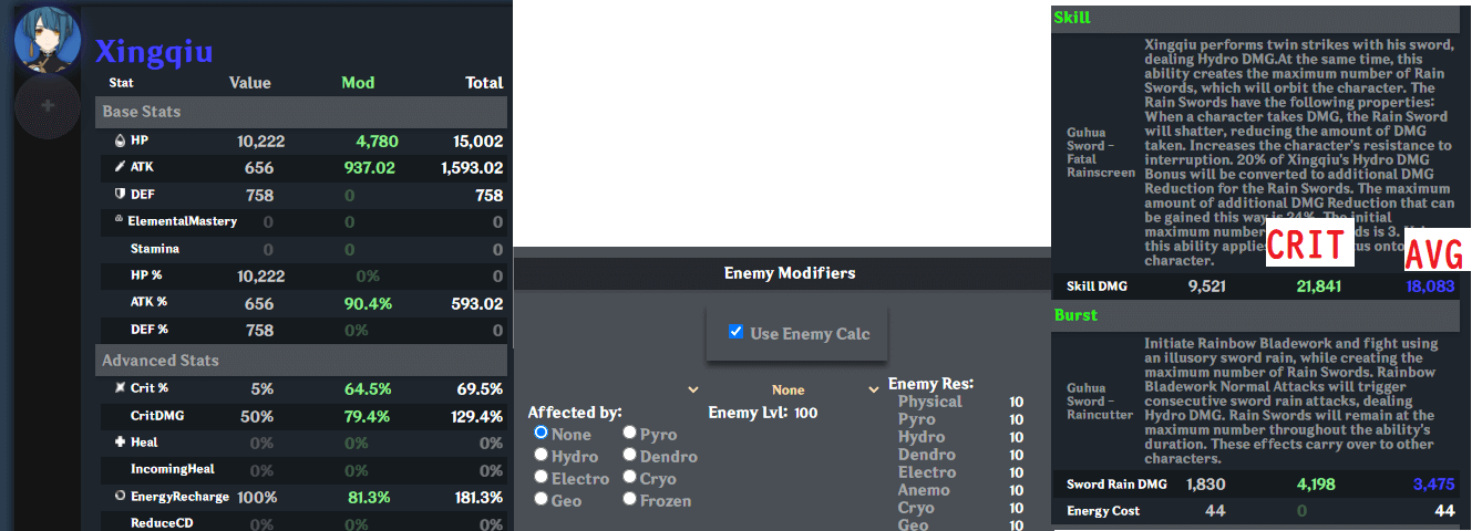 ダメージ計算機に、サブステータス配分をした行秋のステータスを突っ込んだところこのような結果になりました。