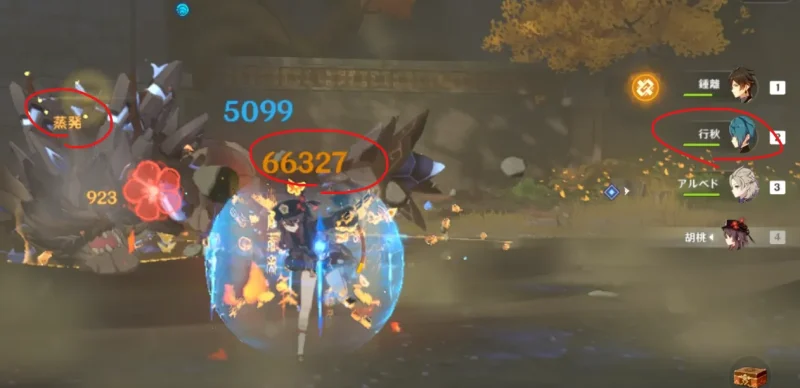 行秋がいる場合の「通常2>重撃」9セットの最後の一撃。蒸発表示と蒸発が乗っていると思わしき66327ダメージ