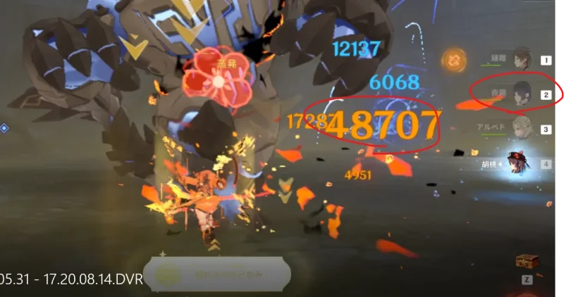 夜蘭がいる場合の「通常2>重撃」9セットの最後の一撃48707ダメージで、おそらく蒸発していない