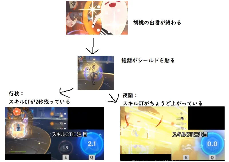 行秋入りの蒸発胡桃編成の場合、以下のようにローテーション(スキル回し)します。