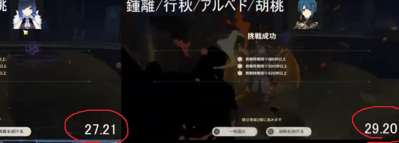 今期螺旋の12-1後半、遺跡守衛2体相手でも夜蘭入り編成のほうが僅かに討伐時間が速いという結果になりました。